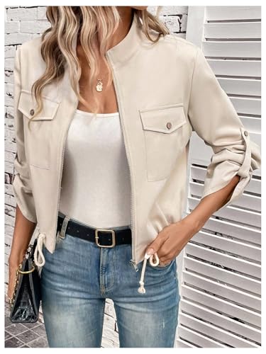 HOT ! Verdusa Women's Roll Up Sleeve Full Zip Jacket Casual Mock Neck Outerwear with Pockets