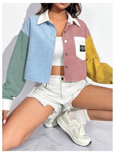 More information about Verdusa Women's Colorblock Crop Jacket Button Front Collared Colorful Outerwear with Pockets