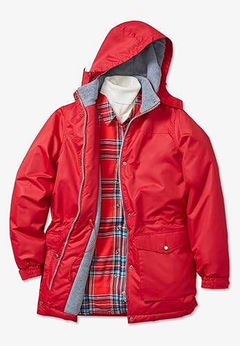• Ready for whatever winter brings. Zip-front closure with snap storm flap. Plush fleece lining. Quilted polyfill in sleeves. Detachable hood. 6 roomy pockets; interior pocket. Adjustable inside drawstring waist.