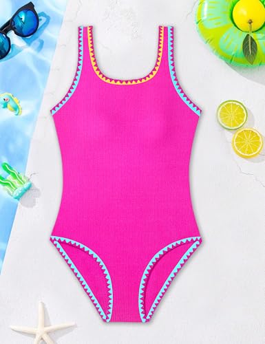 Qaoerde Girls Swimsuit One Piece Swimsuits Solid Color Bathing Suit Colorful Contrast Trim Adjustable Straps Swimwear 9-16Y 1