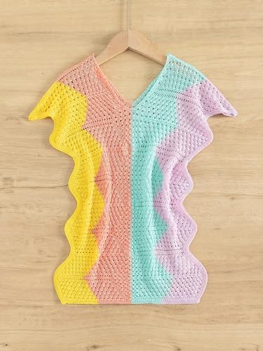 • Features: Crochet beach cover up for girls, scallop trim, v neck, rainbow color block, hollow out, short sleeve