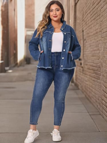 Agnes Orinda Plus Size Denim Jacket for Women Frayed Hem Classic Washed 2024 Denim Jean Jackets 6