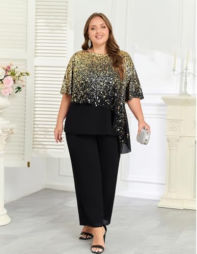 • Feature: Plus size chiffon pant suits for women features in crew neck, chiffon cape sleeve with slit, making you look even more sparkly in the crowd. The pants are lined so dont't worry see through.