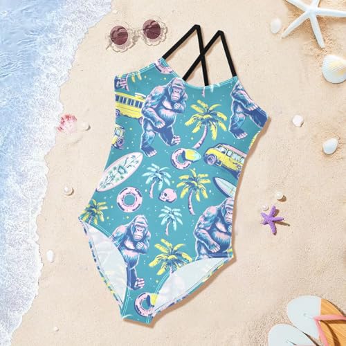 ALAZA Funny Gorilla Palm Tree Bus Girls Swimsuit Bathing Suit Beach Swimwear One Piece 3-10T 1