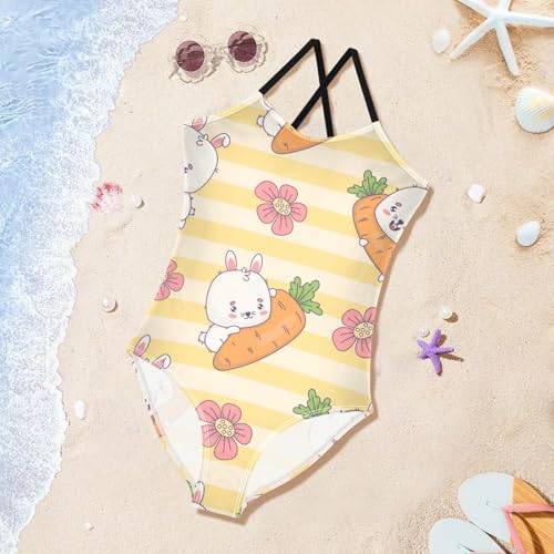 Girls One Piece Swimsuits Bunny with Carrot on Striped Sport Halter Swimwear Beach Bathing Suit, 5-6T 5