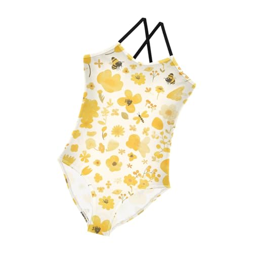 Embroidery Bee Butterfly Flowers Watercolor Kids Girls 1 Piece Swim Suit Beach Swimwear Adjustable Shoulder Strap UPF 4