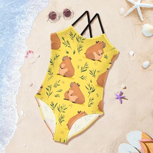 Bolaz Girls Swimsuits One-Piece Bathing Suits Multicolor Kids Sport Summer Beach Swimwear for 3-10 Years Old-Cartoon Capybaras Grass 1