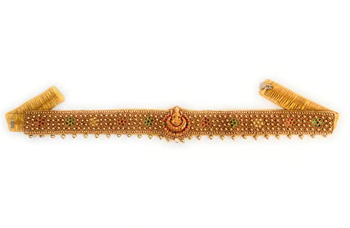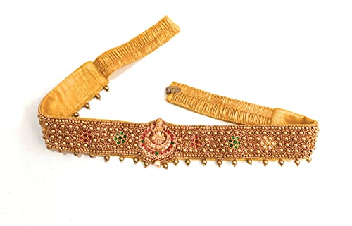 • Adyashree Emporium Women's Traditional Laxmi Cloth Waist Belt for Women Sarees. Stretchable Waist belt with Laxmi pendant for Women's saree. This Laxmi Waist belt is made of cloth and studded with multicolored Green Red stones.